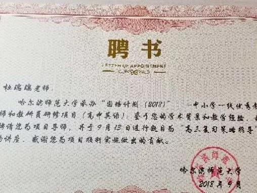 近日,我校杜瑞瑞老師(shī)被聘為(wèi)哈爾濱師(shī)範大(dà)學承辦的 ”國培計(jì)劃”(2018)—— 中小(xiǎo)學一線優秀教師(shī)和(hé)教研員研修項目(高中英語)的項目導師(shī) ,并于2018年9月13日在”國培計(jì)劃”培訓中做(zuò)了有關高考複習策略的專題講座。