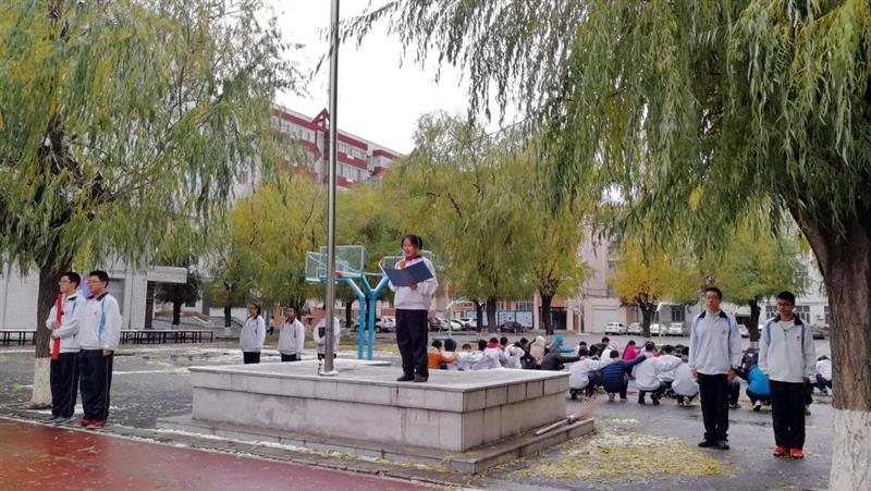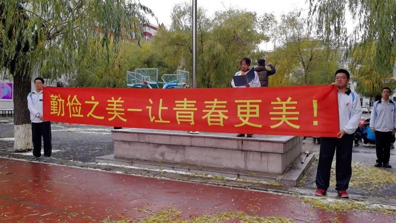 我身後是高二二班全體(tǐ)同學,他們共同用身體(tǐ)擺成了一個(gè)“儉”字,呼籲大(dà)家(jiā)勤儉節約,共創節約校園!讓我們相信:“勤儉之美——讓青春更美!”