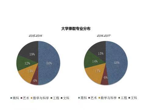 2015-2017年期間(jiān),升入加拿(ná)大(dà)高校的學生(shēng)專業以商科為(wèi)主,占比達到49%,其他專業大(dà)類的平均分布順序依次為(wèi):文科類占比17%;數(shù)學與科學類占比15% ;工程類占比13%;藝術(shù)類占比6%