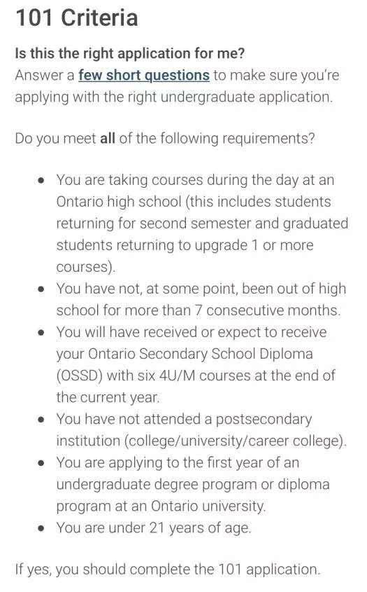 申請(qǐng)安大(dà)略省大(dà)學分101通(tōng)道(dào)(為(wèi)安省高中畢業生(shēng)申請(qǐng)通(tōng)道(dào))和(hé)105通(tōng)道(dào)(非本省和(hé)國際生(shēng)通(tōng)道(dào))