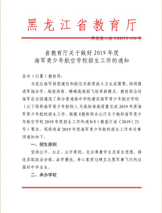 為(wèi)适應海軍轉型建設和(hé)航空(kōng)兵新質戰鬥力生(shēng)成需要,持續推進軍地合作(zuò)、超前培育、精确高效招飛培養新模式,經黑(hēi)龍江省教育廳推薦,教育部會同海軍遴選審核,确定我校為(wèi)黑(hēi)龍江省唯一的一所海軍青少(shǎo)年航空(kōng)學校,組建航空(kōng)實驗班(以下簡稱海航班),從2019年起開(kāi)始招生(shēng)。