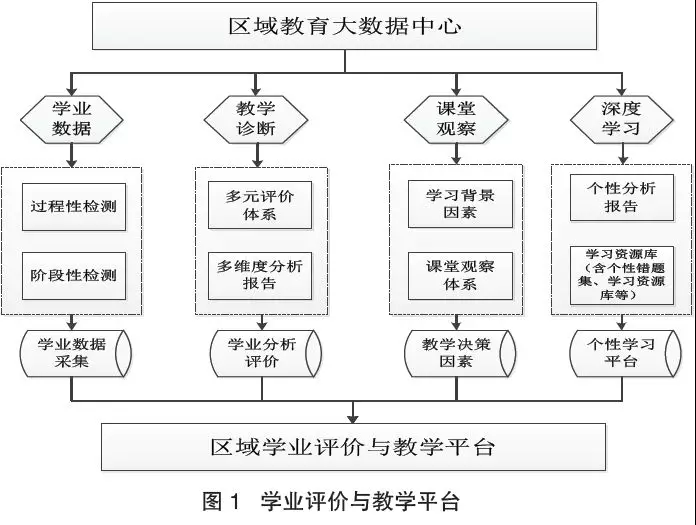 教育大(dà)數(shù)據環境下,通(tōng)過數(shù)據挖掘,發現教學中的真問題,優化教師(shī)的教學決策是改進教學質量的現實需求。區(qū)域通(tōng)過學業數(shù)據、教學診斷、課堂觀察、深度學習建立大(dà)數(shù)據處理(lǐ)中心,形成學業評價與教學平台為(wèi)教師(shī)教育教學服務(圖1)。區(qū)域通(tōng)過整合大(dà)數(shù)據平台,建立起包括體(tǐ)育健康、藝術(shù)、信息、科學等監測體(tǐ)系。在此基礎上(shàng)對數(shù)據進行(xíng)合理(lǐ)的統計(jì)和(hé)解釋,推動和(hé)深化基于數(shù)據的教育教學評價。學校通(tōng)過質量監測對數(shù)據進行(xíng)挖掘和(hé)分析,獲取教學質量及學生(shēng)發展狀況真實、全面的數(shù)據信息。通(tōng)過大(dà)數(shù)據評價的診斷與改進,教師(shī)可(kě)以更好地了解學生(shēng),有針對性地改進教學決策,激發學生(shēng)的潛能,讓教師(shī)從關注學生(shēng)分數(shù)到追求學生(shēng)的全面成長,促進教育優質、均衡發展。