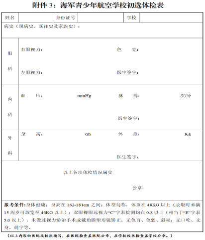進入報名網站(zhàn)後點擊右側“報名體(tǐ)檢表下載”下載《海軍青少(shǎo)年航空(kōng)學校招生(shēng)報名表》和(hé)《海軍青少(shǎo)年航空(kōng)學校初選體(tǐ)檢表》,持《招生(shēng)報名表》到學校蓋章,并持《初選體(tǐ)檢表》到當地醫(yī)院(校衛生(shēng)院)進行(xíng)相關項目自檢。